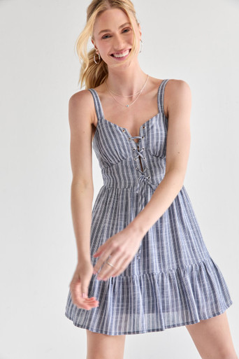 Grommet Tie Up Striped Mini Dress