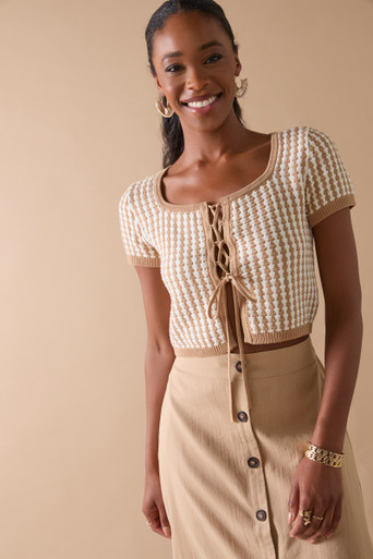 Rib Pattern Tie Front Cropped Sweater Top
