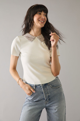 Rib Knit Tweed Collar Short Sleeve Top